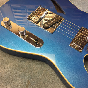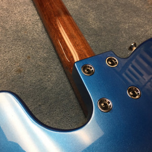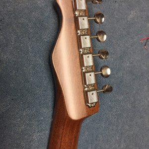 Finished in our own Desert Sand, this light weight guitar of classic California design features vintage style pickups, Hip Shot bridge and gold anodized pickgaurd with ivoriod knobs. The body is very old, light weight clear pine from a limited supply. Necks are available in Walnut, Cocobolo or Rosewood with old style clay dot markers. Necks are finished in lacquer or hand rubbed oil. So, where ever you are, surfs up!