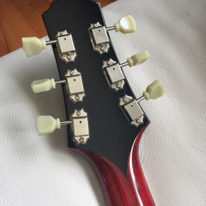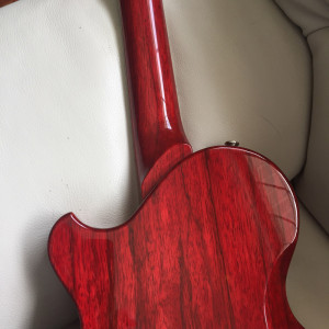 Single cutaway shown in deep cherry. Body and neck are Black Limba. Bound Wenge fingerboard with our ivoriod in brass position markers. Hardware includes Schaller Signum bridge, vintage taper pots, Mojotone Vitamin T oil filled capacitors and Gotoh vintage style tuners.